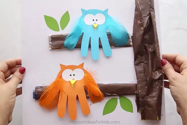As for the owls, you know the drill! Trace and cut out your child’s handprint that serves as the body. Use the colored cardstock to create the rest of the features: two white eyes, one yellow triangle-shaped beak, and another two for the beak (should be the same color as the body). Draw on the pupils using a black marker and lastly, fancify your owl by gluing feathers to the thumb and pinky finger. You can also cut out and glue on green cardstock leaves or anything you’d like to your owl tree craft. Perhaps, a moon at the top?