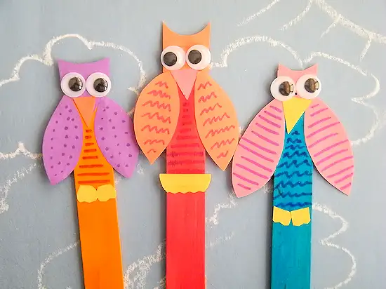 Glue everything in place and let your creativity flow, drawing patterns all over your stick owl craft with colorful markers.