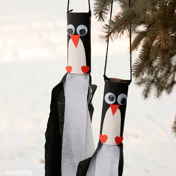 Adding to our list of best easy, affordable, preschool-friendly, and useful at home crafts are these penguin windsocks. Thanks to NonToyGifts for coming up with this project that requires only the following materials: