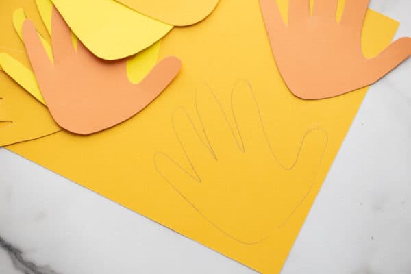 First, have kids paint their paper plates yellow and let them dry. Meanwhile, work on tracing and cutting handprints out from yellow and orange construction paper. You might need six to eight handprint cutouts to cover one paper plate, depending on the size of the children’s hands.