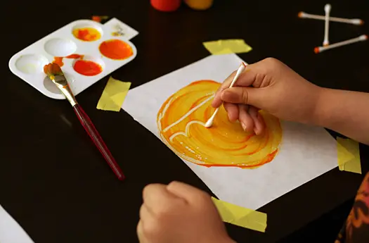 Once your painting area is all set and those little hands are ready, have them dip their brush in either yellow or orange or both, and paint a circle. Be mindful of your paint getting too thick to avoid too much smearing later.