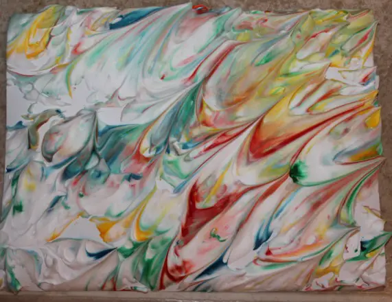 To begin, spray shaving cream over a baking sheet. Next, pour food coloring around the perimeter of the sheet. Swirl colors together using a butter knife. Once you’re happy with the result, place a piece of card stock paper on top of the design and press down until coated; after about 30 seconds to 1 minute has passed, slowly peel off the paper from the shaving cream- side up! Repeat this step as necessary.