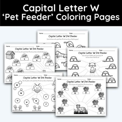 Students will practice finding and coloring the target capital letter “W” in a group of other letters to “feed” the animal featured on the page. This will help them increase letter recognition while working on fine motor skills.