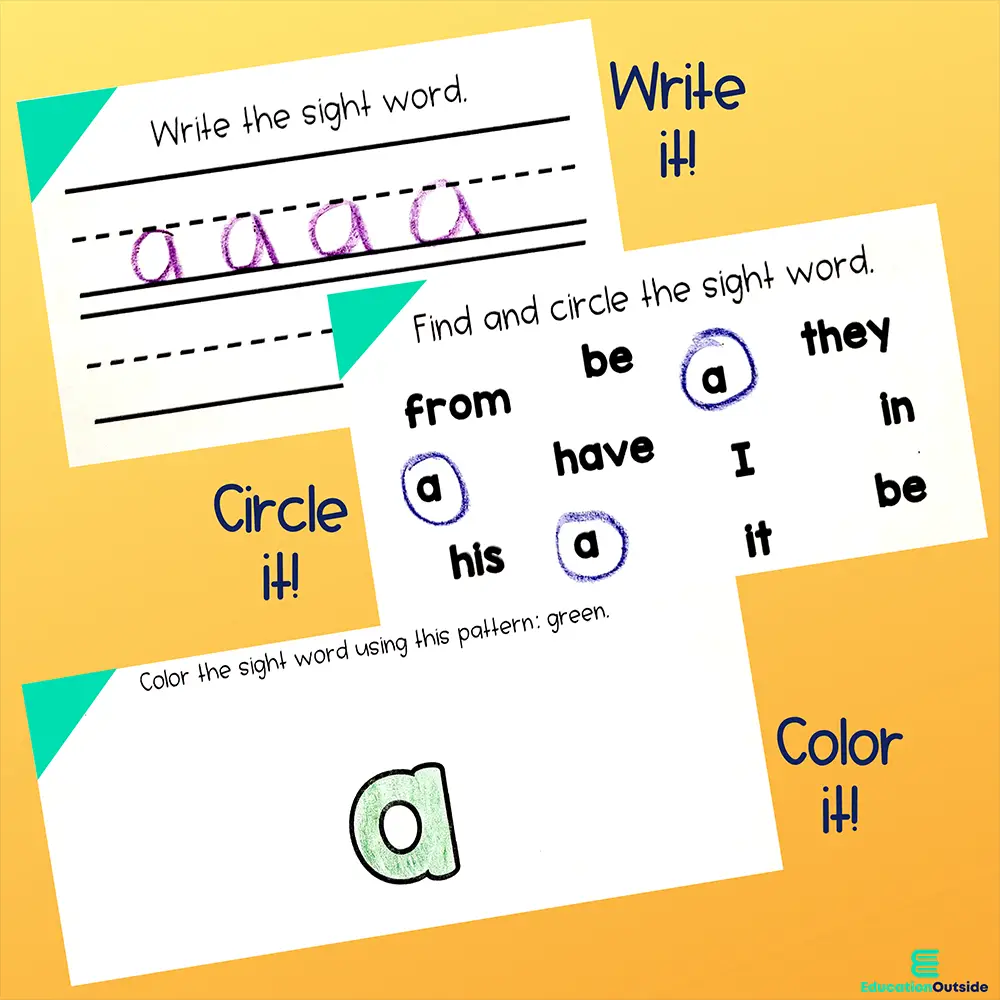 + Coloring: students practice coloring each letter of the target word in a designated color