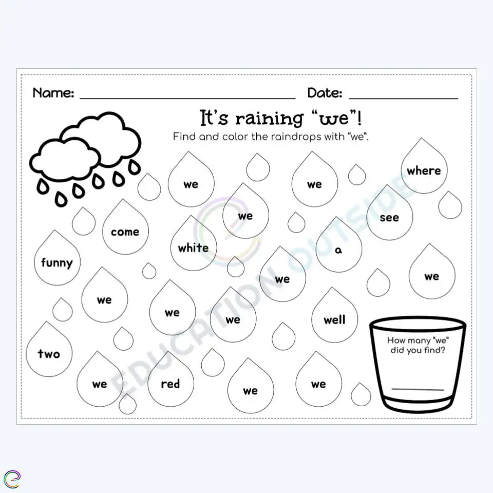 Shower your students with engaging activities that will help boost their sight word recognition like this Raindrop Coloring worksheet!