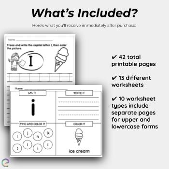 The fun worksheets in this set will entertain and engage kids while learning the letter i. This bundle includes 42 worksheets with activities like coloring pages, coloring mats, cut, paste, and sort, letter searches, tracing sheets, and much more. You won’t run out of options any time soon with this set.