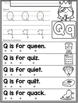 These include a tracing book, cut and paste activity, sentence writing, sorting, classroom posters, center activities, and more! Each item is printable and ready to use. With over 50 pages of materials, you can use this for an entire letter of the week – letter Q curriculum.