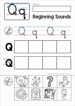 The activities include two penmanship pages, upper and lowercase letter identification, beginning sound identification, and a writing sheet where kids can write a sentence using a word that begins with the letter q. Just print the sheet(s) you need and you’re ready to go.