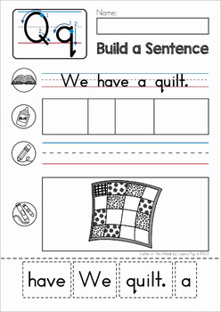 Learning the letters of the alphabet encompasses letter identification and sound association. EducationOutside’s letter q sentences give kids all three aspects. The page includes 6 sentences, each using common sight words along with an image to associate with the letter sound.