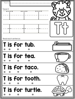The stars at the end of sentences allow kids to track as they read each sentence twice. This is a great activity for centers, home practice, as a group activity, or as an assessment tool. These are printable, require zero preparation, and have fun picture clues. You can print these in black and white or color, depending on your needs. With these sentences, not only are you practicing the letter t, you are also increasing reading fluency and sight word recognition!