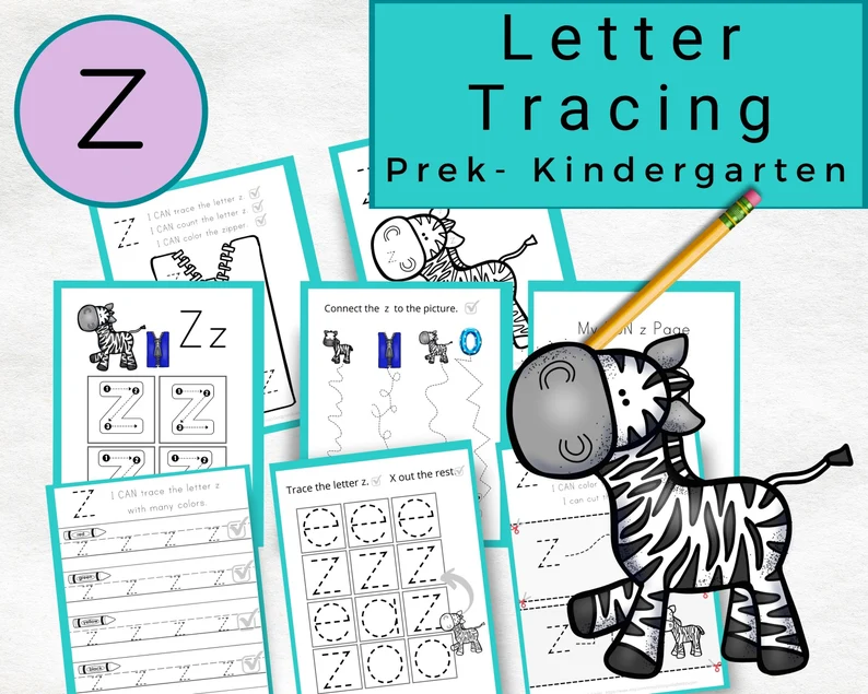 Tracing lines and letters is the cornerstone for letter formation. And this set of letter z tracing pages from DesignsbyBekkiSayler provides plenty of that. You get 8 pages of tracing fun which includes tracing the letter z, tracing various lines to get to the letter z, and associating pictures with the beginning sound.
