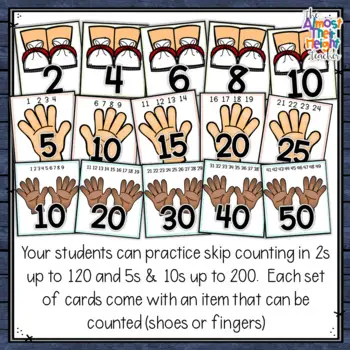 Looking for something a bit more colorful? This set of skip counting sheets by AlmostTheirHeight include colorful images ranging from hands and frogs to feet and rocket ships to illustrate the patterns. With this product, you get 83 printable pages to engage and instruct how to count by three major counting patterns.