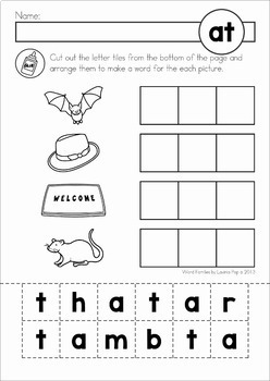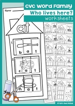 This fun worksheet set by FromThePond provides 13 pages of practice covering the word families at, ag, am, ed, en, et, ip, ig, in, op, ot, ub, and ug. Each page features one word family. Cutting out words and pictures help kids work on fine motor skills while also working on manipulating the beginnings of words to create a bunch of different words in the same family.